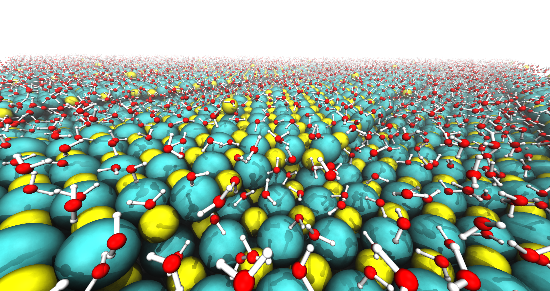 We also have a keen interest in polar crystal surfaces. We are interested in polar surfaces because they are catalytically active, can control the shapes of crystals (at both small and large length scales) and influence how particles in solution interact with each other. We also think their physical chemistry is fun! We have had to overcome many technical challenges when trying to simulate polar surfaces in contact with liquid solutions. We have found that standard simulation methods lead to qualitatively incorrect results whereby dissolved ions are repelled from charged crystal surfaces. This work on polar crystal surfaces is relevant to our studies on ice nucleation on AgI. But we are also interested in understanding how crystals exposing polar surfaces form from their melt, in a process known as “molten salt synthesis.”